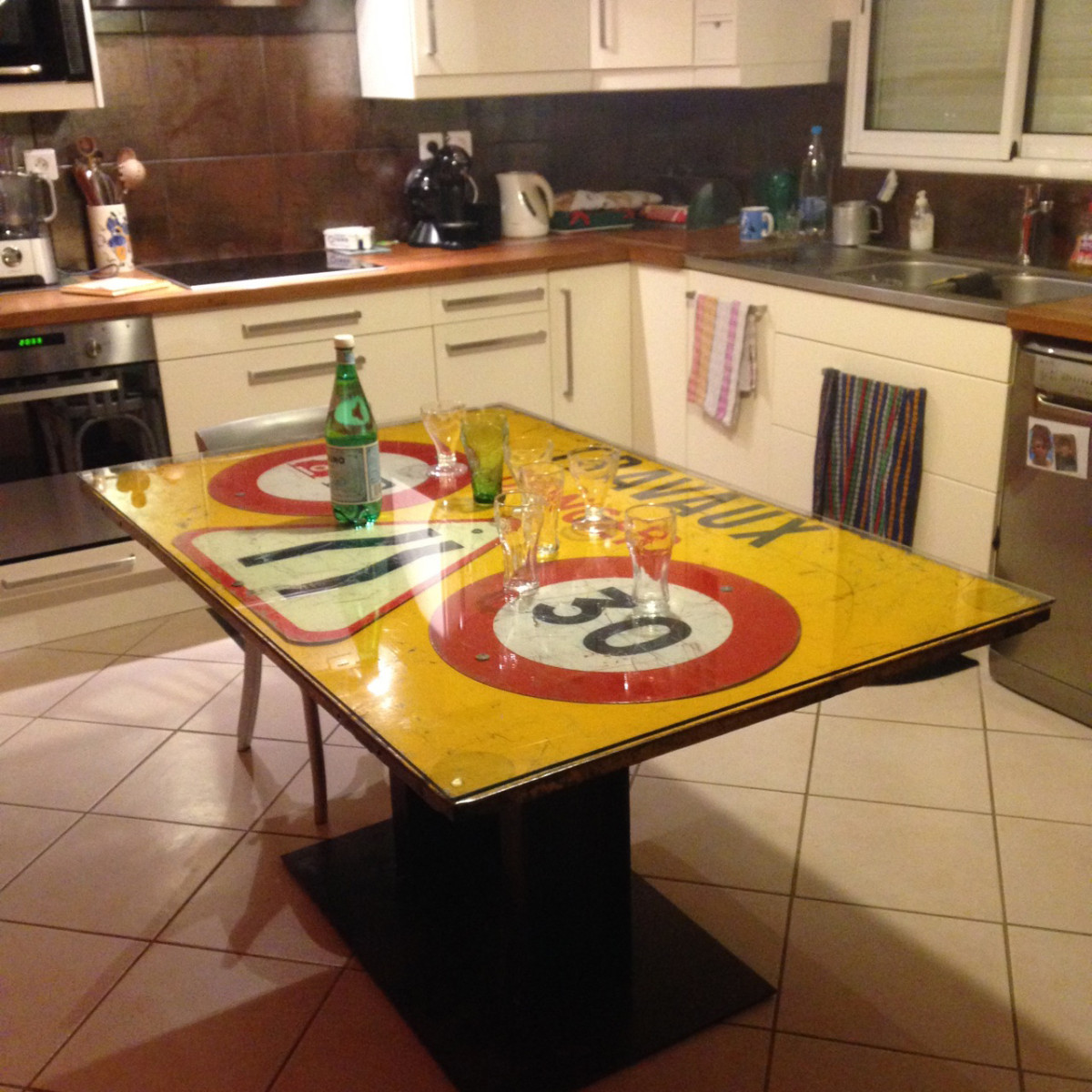 Table de cuisine fabriqué en acier, le plateau et un panneau de signalisation en acier surmonter d’un plateau en verre et le pied est réalisé avec 2 poutres UPN et un socle en acier.